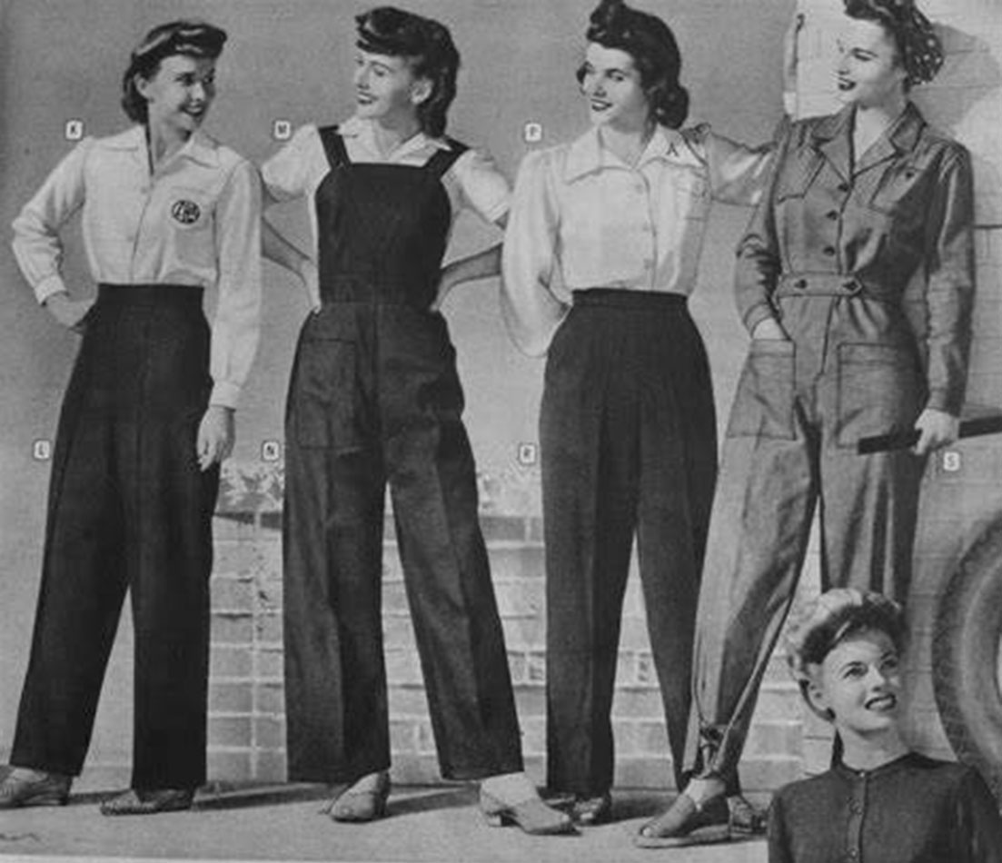 二次世界大战带来烽火下的时尚,在物资短缺的情形下,设计风格偏向简单朴素,军装风格盛行。外套式洋装、西装和合身短裙成为办公女士的首选,吊带裤、工作连身服也是新独立女性不可获缺的单品。颜色上偏好低调的灰、棕色系,同时利用西装垫肩凸显女性的干练气息。