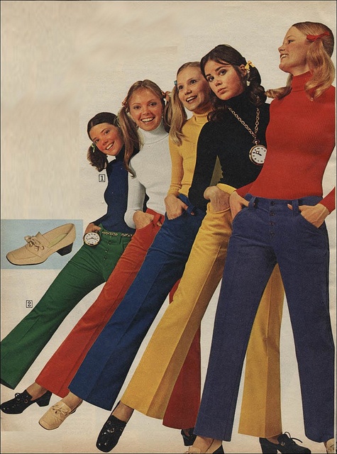 蜕去保守的社会观点,大家选择多元化的嬉皮风格做为反动。Disco 音乐带动了社会的改变,职场女性则以代表的喇叭宽裤及高跟皮鞋展现态度。