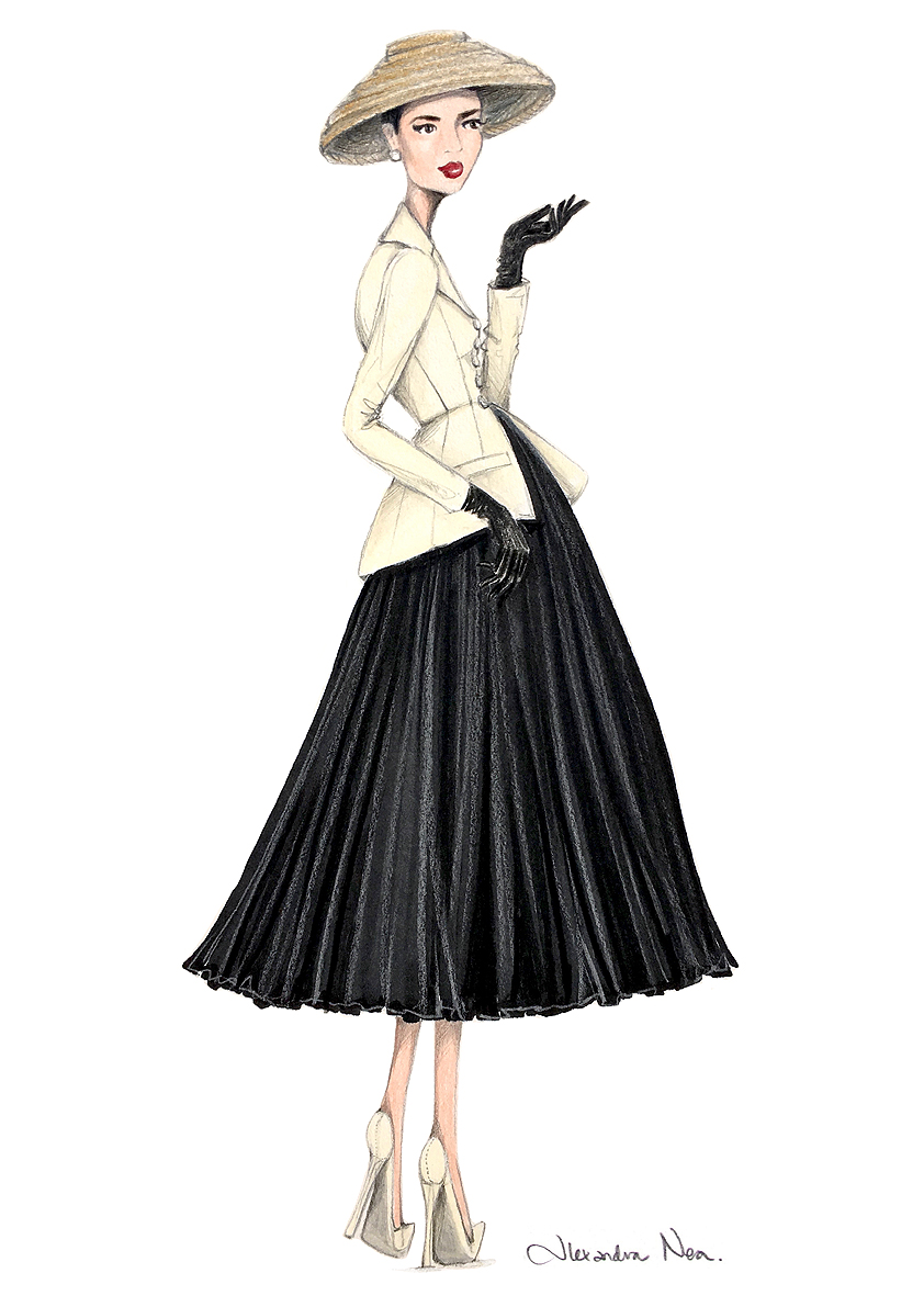 Dior 的 New Look 开启腰身与圆裙风潮,裤装不再是新女性的首选,反而是传统柔和的女性化套装。历经颠簸的岁月后,女性选择以明亮的色彩、印花图样、A Line轮廓取代原本刚硬冰冷的线条,重新收紧的腰身展现出女性曼妙身姿及高雅气质,以优雅妆点了1950年代的办公室。