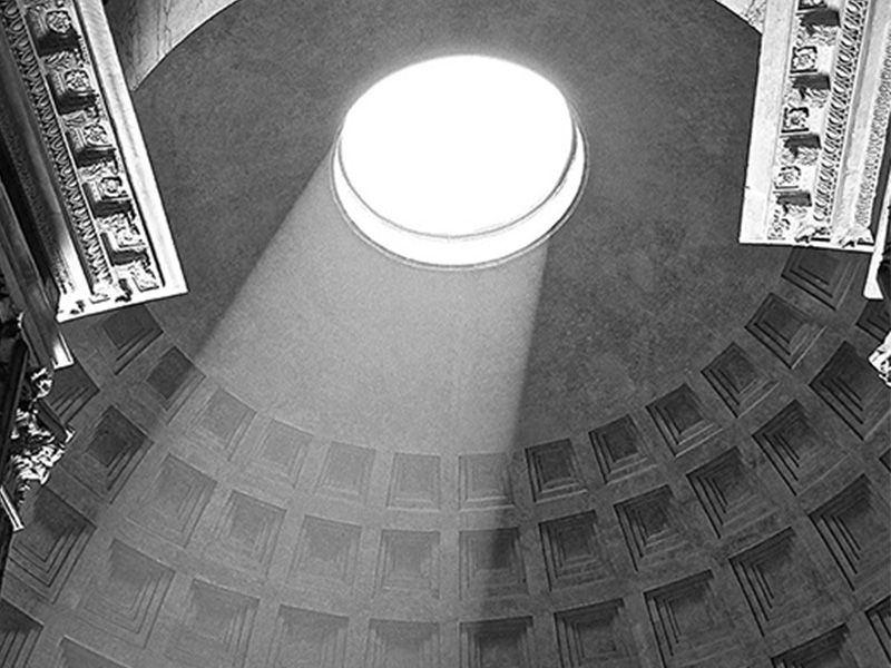 而当安藤忠雄旅行至广岛参观丹下健三于1995年设计的和平纪念公园时,看到清水混凝土的质感,受到莫名的感动。最后对他影响很深的是罗马万神殿穹顶中央9米的洞孔光。